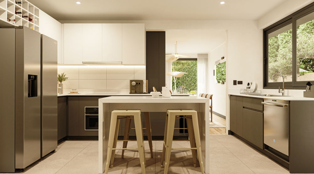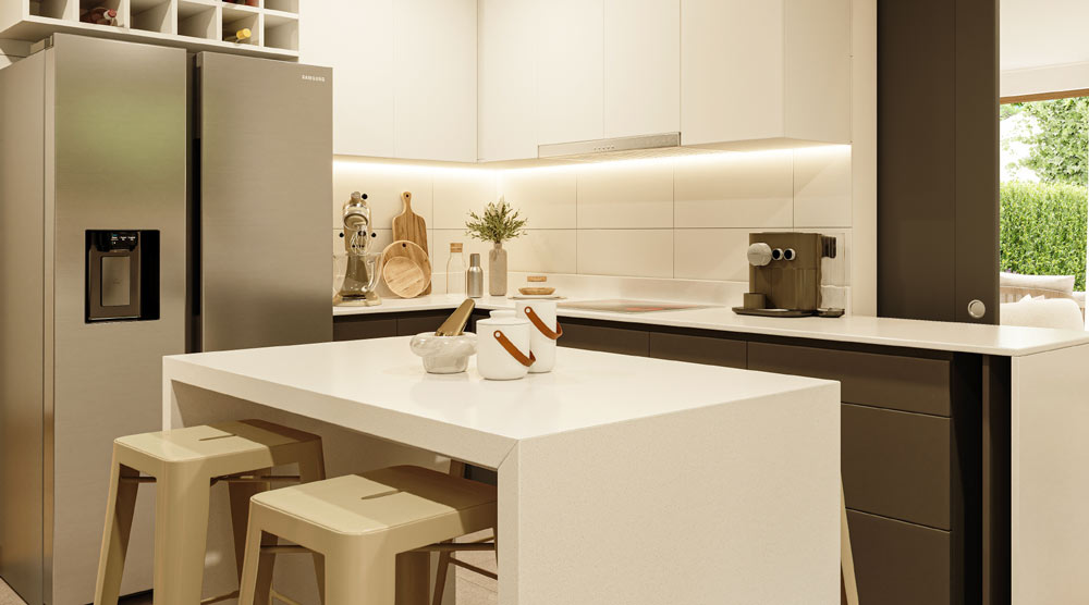 Las encimeras de cocina en cuarzo White Absolute y horno convencional marca Teka combinan elegancia con durabilidad.