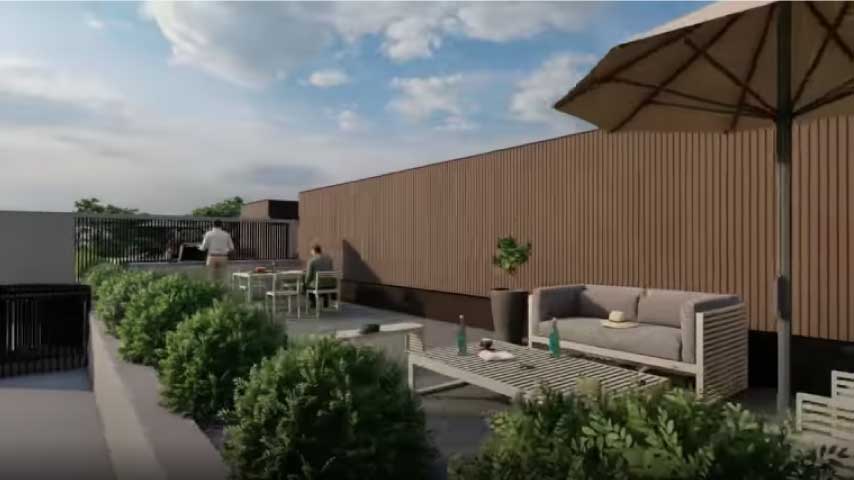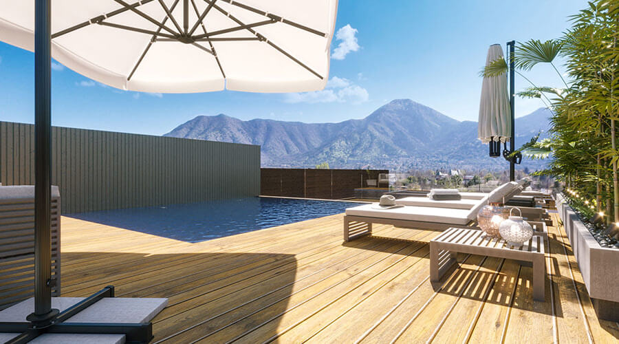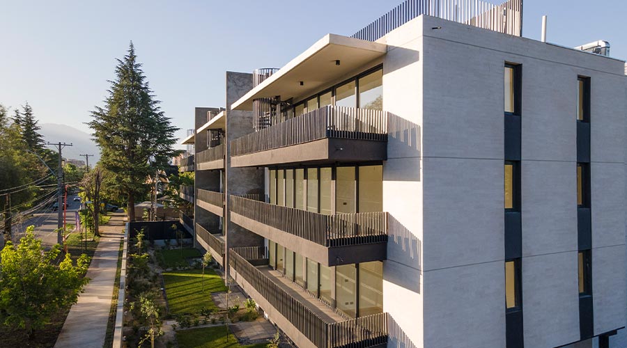 Los departamentos del primer piso se vinculan directamente con el jardín y los del último cuentan con grandes terrazas para disfrutar de vistas privilegiadas al cerro Manquehue. Sus pisos intermedios poseen terrazas continuas, lo que genera espacios más amplios.