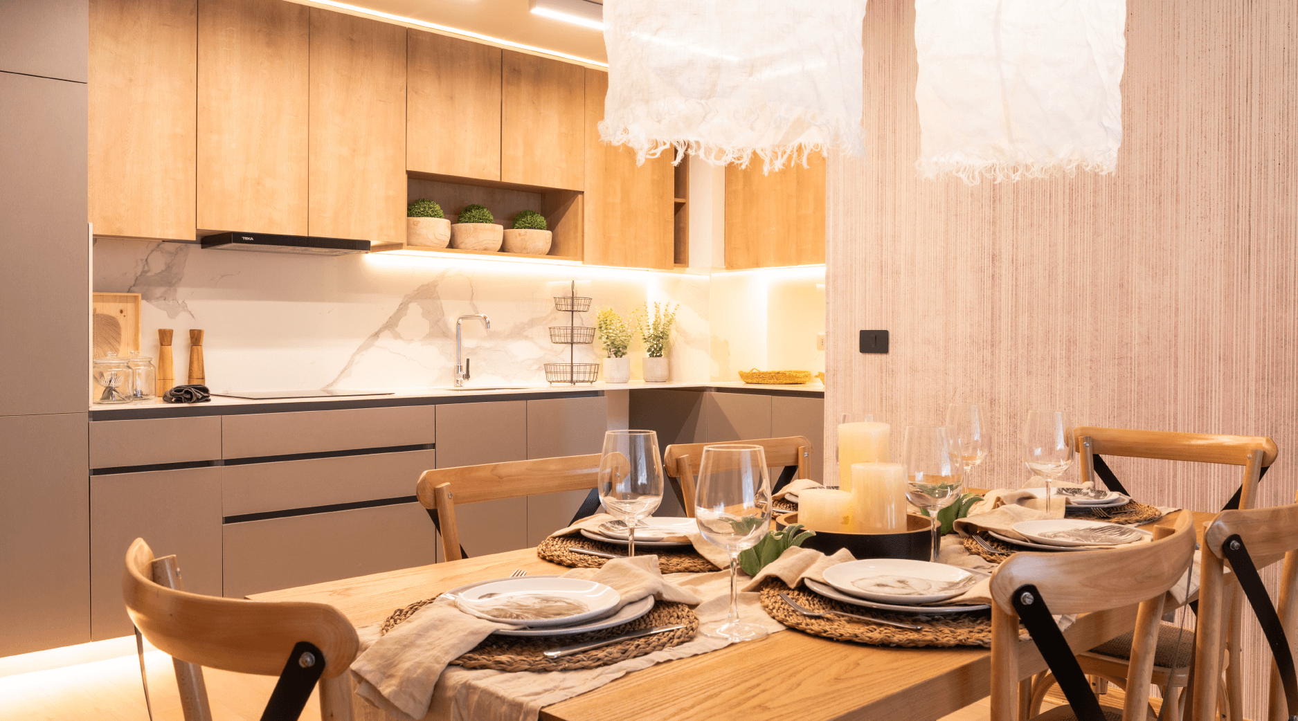 Los departamentos cuentan con cocinas equipadas e integradas con amplios y diversos espacios para guardar.